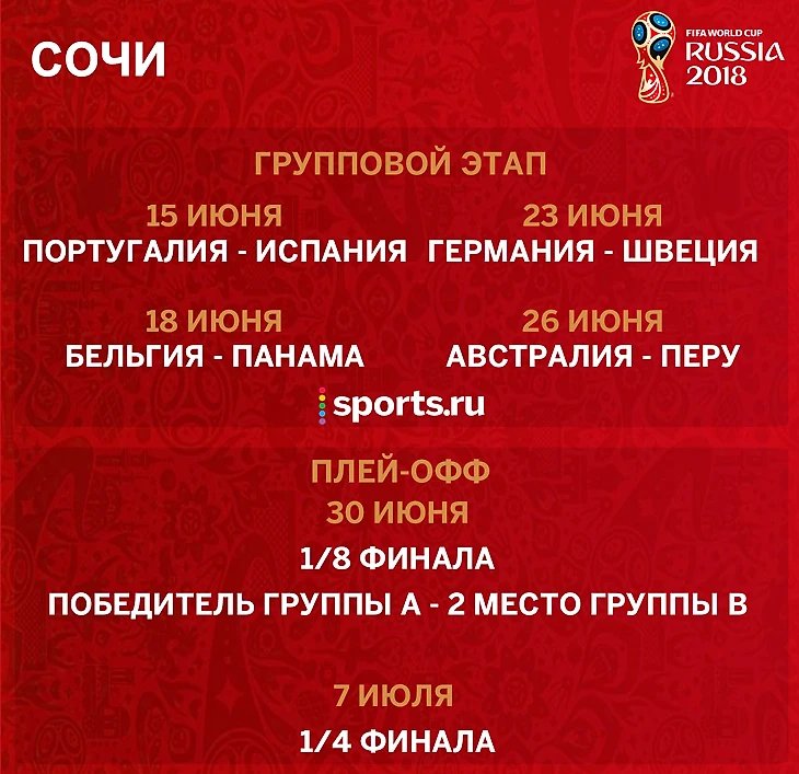 Для проведения футбольных матчей Чемпионата выбран стадион «Фишт». Спортивная арена была построена 2013 году специально для Олимпиады: здесь проходили церемонии открытия, закрытия игр и награждение спортсменов. Она расположена в «Олимпийском парке», что раскинулся на территории Имеретинской низменности. По внешнему виду спорткомплекс напоминает одновременно ракушку и заснеженную вершину. Назван он в честь одной из самых известных гор Главного Кавказского хребта, имя которой с адыгейского переводится как «белая голова». Для ЧМ 2018 проводилась реконструкция. Вмещает 40 тыс. зрителей, но после ЧМ-2018, уменьшит количество мест до 25 тыс. Здесь пройдут групповые матчи и одна из игр 1/8 финала ЧМ-2018. На обновленном стадионе четыре трибуны — две крытые и две открытые. Крытые трибуны накрывают конструкции крыши, которая состоит из двух отдельных частей. С трибун можно увидеть горы и море.