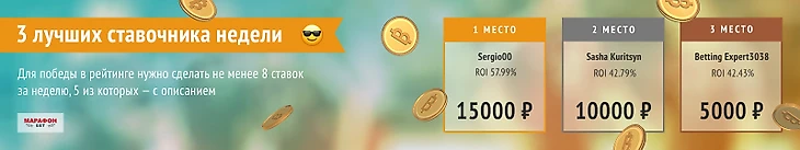 Всем привет! Betting Insider подводит итоги прошедшей недели и раздает призы. Напомним, три лучших игрока недели получают фрибеты от БК «Марафон».