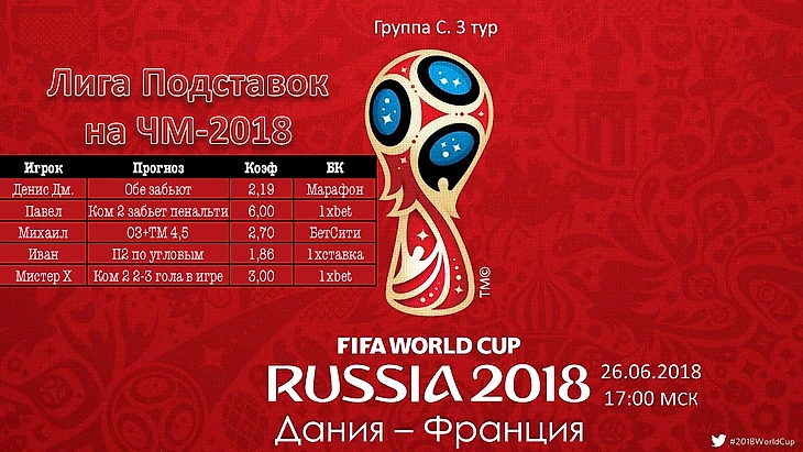 Ниже варианты ставок наших участников матч чемпионата мира по футболу - 2018: Дания - Франция.