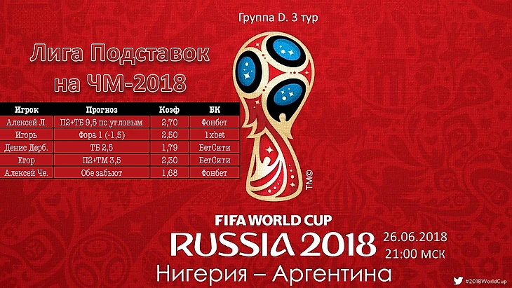 Ниже варианты ставок наших участников матч чемпионата мира по футболу - 2018: Нигерия - Аргентина.