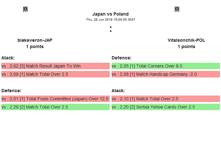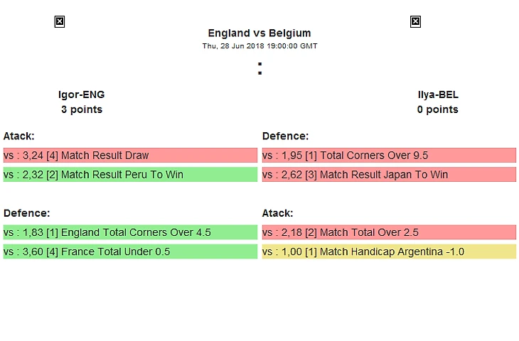 В группе G все предельно ясно! Игорь и Илья очень уверенно провели первые два тура и также, как и их сборные Бельгии и Англии набрали 6 очков, оформили досрочно выход из группы и в последнем туре имеют возможность улучшить свой баланс для более высокого посева при выборе соперников по ПО. Напомню, что в реальной жизни Англия и Бельгия имеют одинаковый баланс мячей 8-2 и в случае ничьи 1-е место займет команда с меньшим кол-вом желтых карточек. Ну а в нашем турнире в случае ничьи 1-е место в группе G скорее всего займет Игорь Козинец, так как у него баланс повыше и уже зашли ставки с коэффициентами 2,32 и 3,6.Остается надеяться только на то, что Непал и Владимир найдут в себе силы для голов престижа и сделают ставки на матчи Туниса с Панамой и на какие-нибудь еще завтрашние события.А мы отправляемся в группу H, где, к сожалению, сенегалец Валинтерама потерял шансы на выход в ПО, но он еще может сильно попортить нервы колумбийцу Александру, на прощание обыграв его или сыграв с ним ничейку, тем самым не пустив его дальше. В другой паре лях Витальсончик уже бьется с самураем Бякавероном то ли на мечах, то ли на мячах. Ясно одно – в 1-й половине Бякаверон сумел уже отразить польский выпад, а вот Витальсончик не подготовил свою защиту, но еще не известно, воспользуется ли этой оплошностью японец, ну и конечно же вместе с ними будем ждать второго тайма этого поединка.