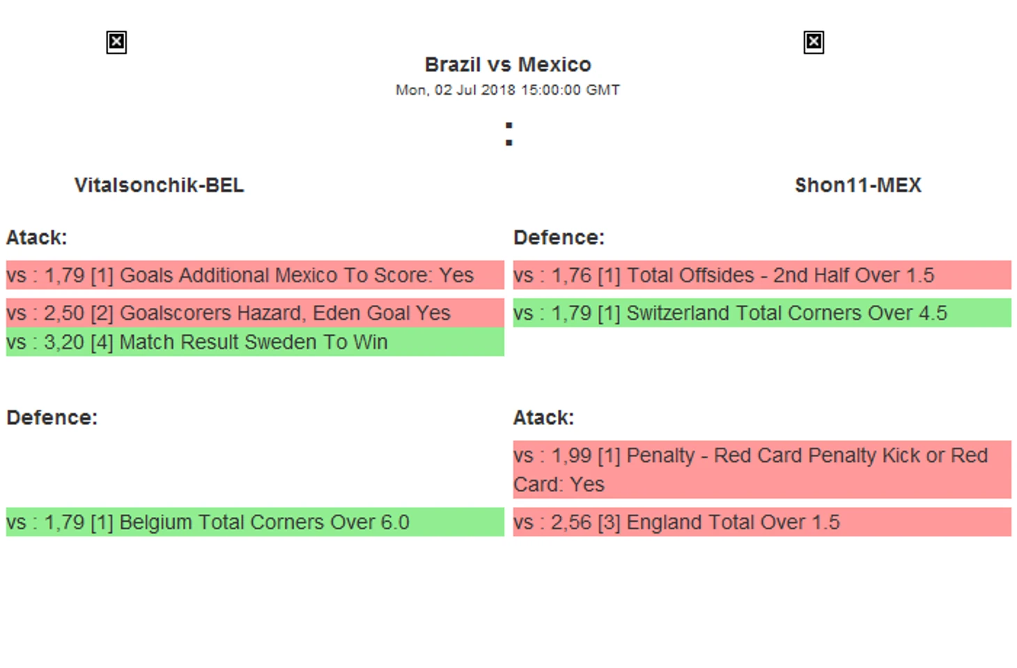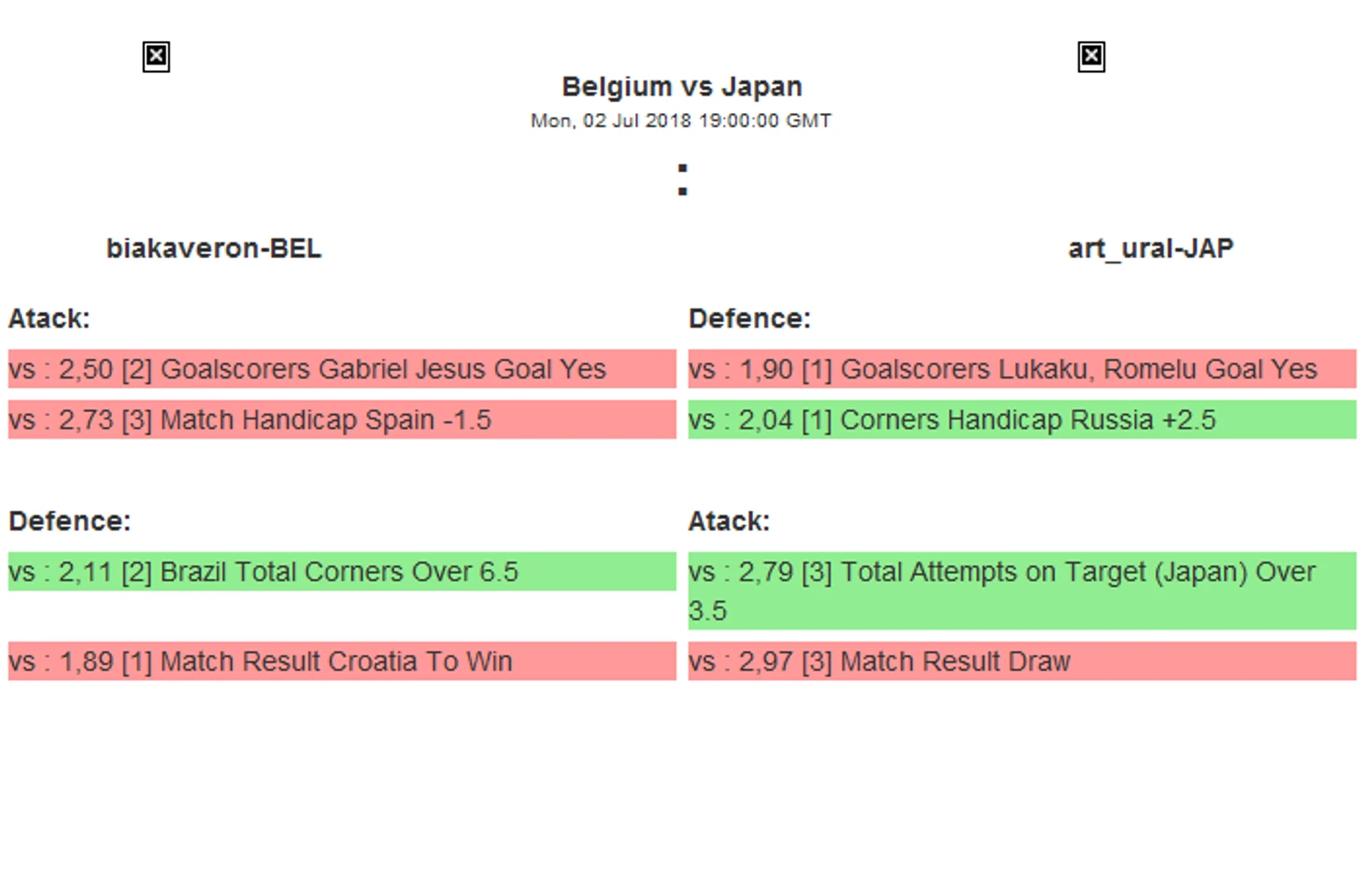 А что у нас ? У нас valinterama и Respect пока жду матча Бельгия - Япония, шансы у valinterama пройти большие, Respect надо надеятся на удачу или говоря прямо на Японию. Vitalsonchik тоже надо надеятся на Японию иначе Ervand01 проходит этой своей командой, другой он уже прошел Респекта, поздравляем ! Shon11 другой четвертьфиналист, он по кэфам обыграл hodyry, поздравляем !