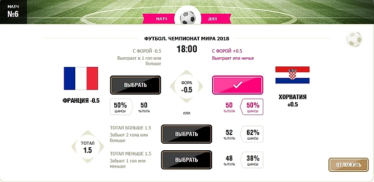 В "Матчах дня", естественно, в новом ТОТО-15 представлен финальный матч ЧМ. Предположу, что Хорватия не проиграет Франции, то есть Хорватия с форой +0. Тотал больше или меньше 1,5 не важен, поскольку закрываются две эти позиции.