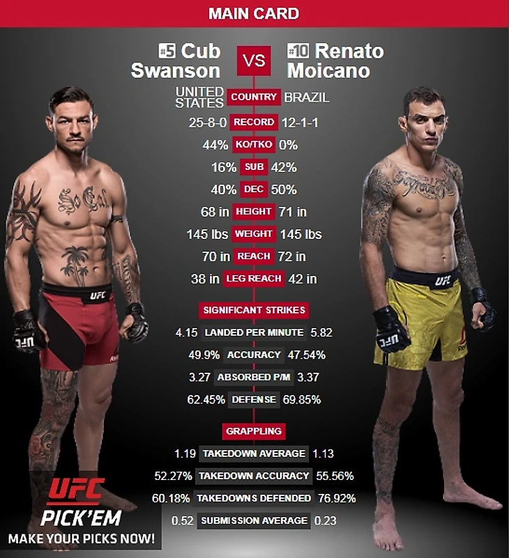 Эффектный, захватывающий и притягательный боец Каб Свонсон против методичного, атлетичного, но скучного Ренато Мойкано