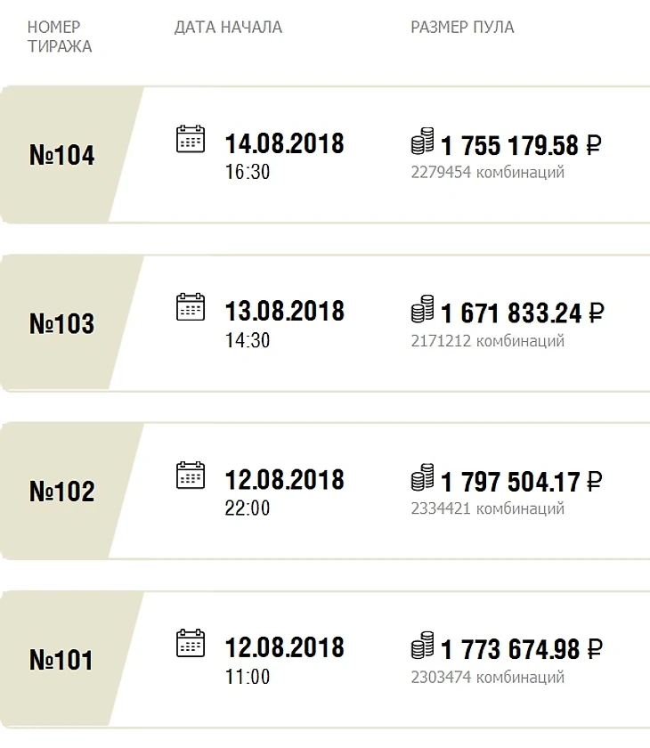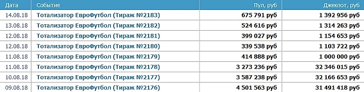 В ТОТО-15 сумма джекпота (даже после его снятия) не изменится - главный приз не сформирован пулом. Пул же - а как видно, он довольно неплохой для только развивающегося тото-проекта - миллион семьсот в среднем.