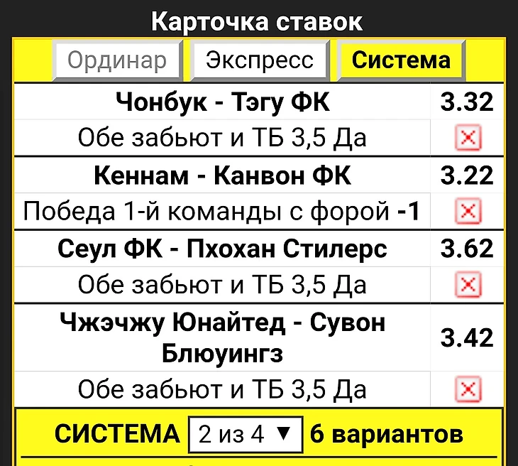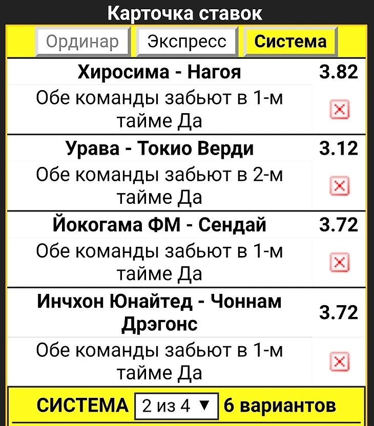 ну а здесь немного более рискованный вариант на Японию и Корею. Варианты с обменом голами в первом и во втором таймах. система 2 из 4, 100р.