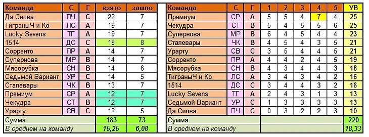 Лучшие команды тура по сумме УВ в целом: Премиум, Чекудра (по 25 вариантов)