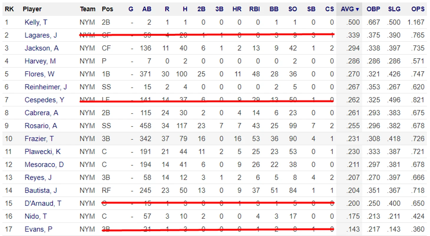 Левшей у “Метс” дохера) И что смешнее всего - все здоровы, чего не скажешь о травмированных праворуких бьющих. Лагарес, Сеспедес, Эванс, Ривера, Райт, дАрно, все вылетели. А нормально бьют из правшей всего Джексон и Флорес, не самые лучшие бьющие команды.