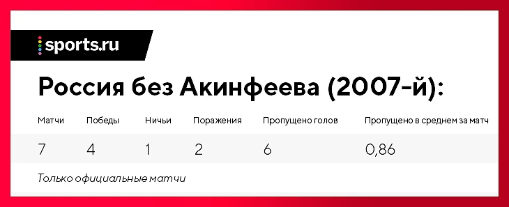 В мае 2007-го Акинфеев в проходном эпизоде матча за ЦСКА повредил крестообразные связки: до конца квалификации в сборной его заменяли Вячеслав Малафеев и Владимир Габулов.