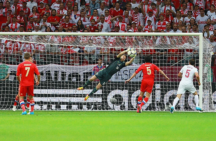 • 12 июня 2012-го, Польша – Россия – 1:1, в воротах Малафеев. Наши сдержали свирепых хозяев, которые пробуксовали на старте; вратарь, вероятно, оказался с отрывом лучшим на поле (несмотря на вдохновение Дзагоева и Аршавина). Для выхода из группы теперь хватало ничьей в последнем туре.
