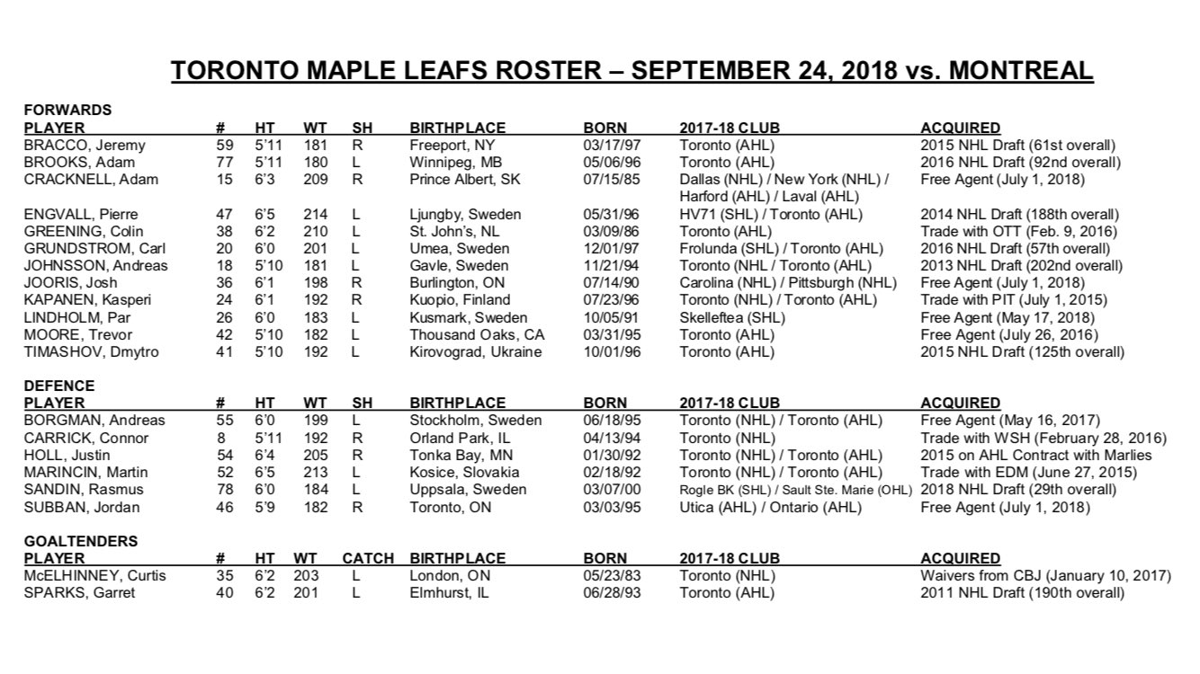 Для тех кто не разбирается в Национальной Хоккейной Лиге но хочет поставить на этот матч, вам нужно знать одно - это полностью резервный состав. Вот вам подтверждение в виде ссылки на твиттер Торонто где они опубликовали заявку - https://pbs.twimg.com/media/Dn0YmXOXsAADvZr.jpg:large разве что Капанен да Маккелини привлекались, ну и Каррик. Все остальное - АХЛ.