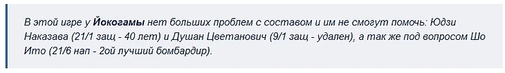 Как видим у гостей большие проблемы и им не смогут помочь ключевые исполнители, которые в атаке забили большую часть голов команды. Так что в этой игре им ничего хорошего не светит. И жду победы Йокогамы.