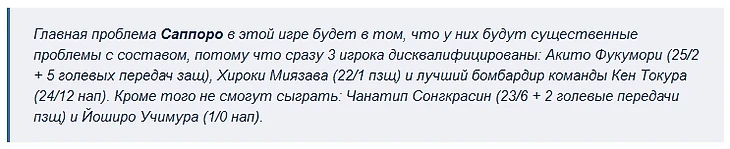 А вот что касается Саппоро, то они в последних матчах неважно играли, а сегодня намечаются серьезные проблемы. Они в последних турах много пропускали и проиграли 3/4 последних матчей.