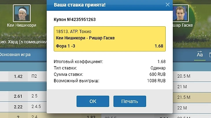 Японец играет дома, в теннисе это не всегда важно, но в Азии культура данного вида спорта, а особенно боления, не высока, так что на соперников зрители могут действовать очень раздражающе. Нисикори в отличной форме, после травмы он прогрессирует весь год, на последнем Шлеме дошел до полуфинала и находится на пике именно сейчас. Кею победа больше нужна и с мотивационной точки зрения. Нисикори борется за попадание на Итоговый Турнир АТР. Отставание от восьмерки не самое маленькое, но впереди еще два Мастерса, да и триумф в Токио даст не мало очков, а Кевин Андерсон, идущий на заветной восьмой позиции, здесь уже оступился, да и вообще находится не в лучшей форме. Нисикори же не летал в Чикаго на Кубок Лэйвера, а был нацелен именно на азиатскую серию и в Токио показывает очень солидный теннис. По личным встречам преимущество Гаске, но за счет игр до 2016 года, когда француз еще был в элите, но постепенно они шли по рейтингу навстречу друг другу, и японец уже гораздо выше. У Гаске хронические проблемы со спиной, ему тяжело играть в быстрый энергозатратный теннис, хотя он сам всегда был легок на корте. Здесь он сыграл два матча подряд с Киргиосом и Андерсоном, выиграл их только на тайбрейках, измучился в защите, обрабатывая мощнейшие удары. Здесь же ему предстоит сыграть против теннисиста другой школы, который не столь мощен, как австралиец или южно-африканец, но куда более активен и разнообразен, также Нисикори гораздо лучше играет на приеме. В итоге, на мой взгляд, в этой встрече все за хозяина кортов, мое мнение разделяют и букмекеры, которые дают вполне рабочий коэффициент 1,45 на чистую победу. Но я думаю, что если все пойдет по плану, то Нисикори победит не на тайбрейках, а сделает это достаточно уверенно, как и на протяжении всего турнира, поэтому беру фору (-3) и делаю 60% от банка.
