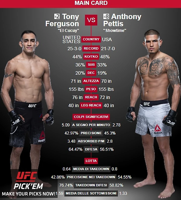 Столкнуться два ярких ударника, которые «хороши» в слабостях оппонентов! От этого битва становится только интереснее. Петтис отлично работает на дистанции как руками, так и ногами, а это, как показал Кевин Ли — слабая сторона Тони. Фергюсон мастерски рассекает в клинче и гарде своими «бритвами», а ближний бой — слабая сторона Энтони, что показал Дастин Порье.