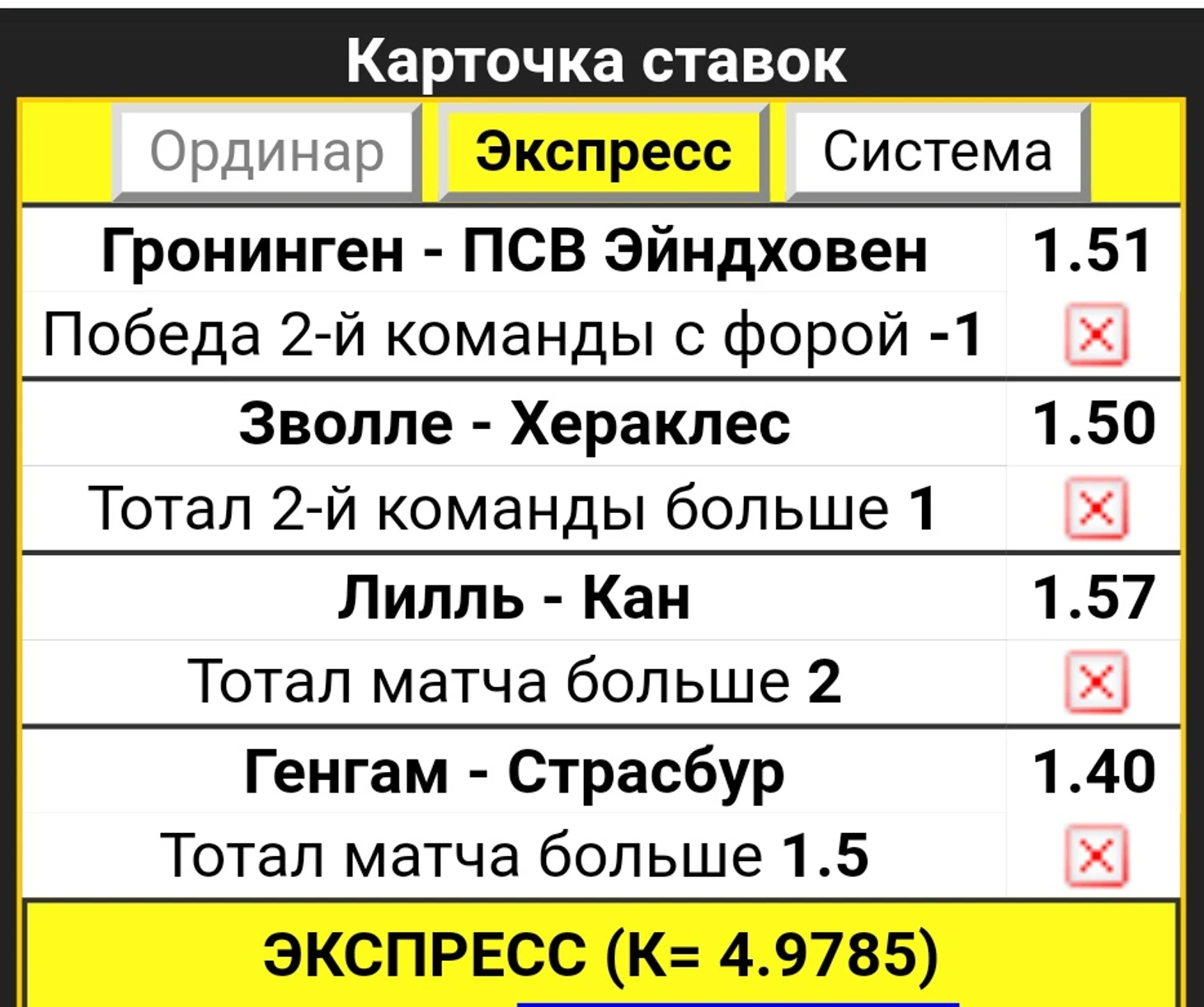 Так вот: "Дай пять" - это экспресс, кэф которого будет приблизительно 5. Я уже давно в ставках и проанализировав те вещи, которые чаще проходят могу сказать вот что: если экспресс будет собран из небольшого числа событий (4-5) и не будет особо привязан к победе той или иной команды, то его шансы на проход будут велики!!!!! Да-да! Может это только для меня? Но это прямо золотая середина какая-то.