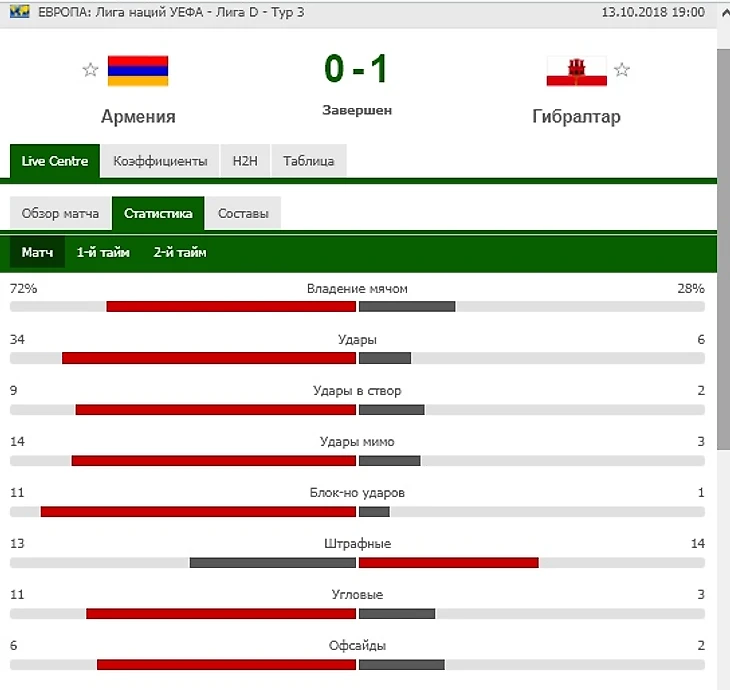 Но всё это не отменяет превосходства в классе армян, напор которых второй раз подряд вряд ли удастся выдержать. Чтобы аргументировать факт того, что первый матч - это огромное исключение, стоит привести статистику Гибралтара, который с первой своей официальной игры, датированной в 2014 году, и до сего дня, пропустил 122 мяча в 29 встречах.