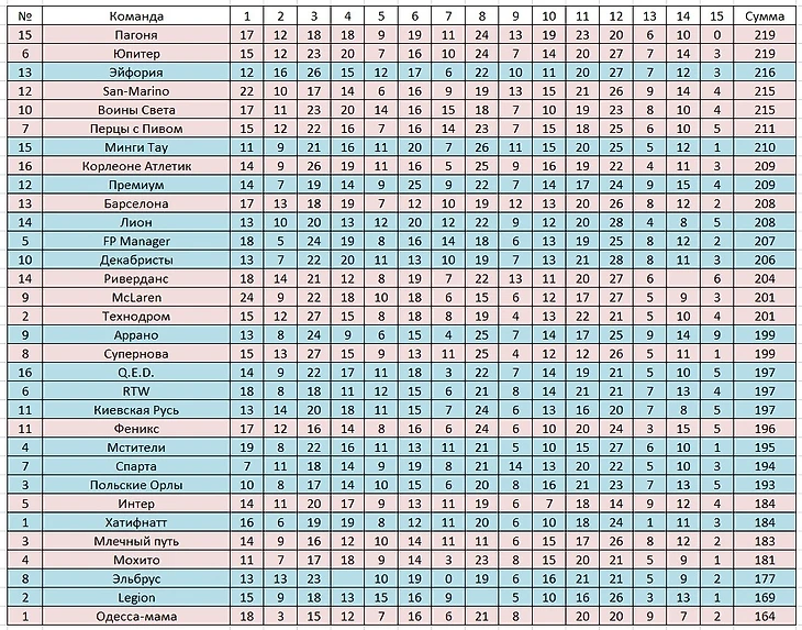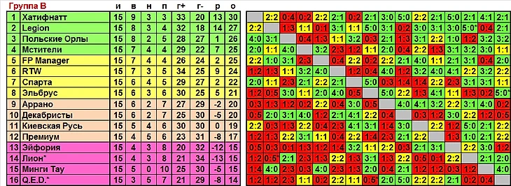 Таким образом, за чемпионство продолжат борьбу 8 команд, поздравляю всех пробившихся в зоны 1-4 своих групп, отдельно - Мохито и Мстителей, запрыгнувшим туда в 15-ом туре, подходя к нему в статусе догоняющих. Остальные 6 претендентов на титул либо обеспечили себе проход в чемпионскую пульку досрочно, либо сохранили зачётные позиции по итогам последнего тура.