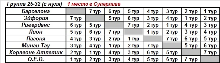 Интер и RTW из топ-4 выпали, поборются теперь за два места 10-ки Апертуры в группе 9-16 и путёвки в Суперлигу на следующий сезон. Отмечу, что в нынешнем цикле завоевать места в СЛ из второй группы чемпионата не так просто, как раньше. Это же относится и к группе 17-24. К слову, за само попадание в третью по статусу группу разгорелся жёсткий спор среди команд группы А, аж 4 команды на стыке зон 9-12 и 13-16 набрали по 16 очков, и понадобилось рассчитывать их мини-турнир личных встреч. В итоге Феникс и San Marino выступят в более высокой группе, а Барселона и Риверданс отправляются в группу аутсайдеров 25-32, из которой, впрочем, победитель гарантированно получит место в Суперлиге на весну 2019. В группе В сформировался один мини-турнир из 3 команд, но большого стратегического значения он не несёт, вся тройка с мест 13-15 отправляется в низшую группу (25-32), и, повторюсь, результаты очных игр первого этапа на финальном не отразятся.