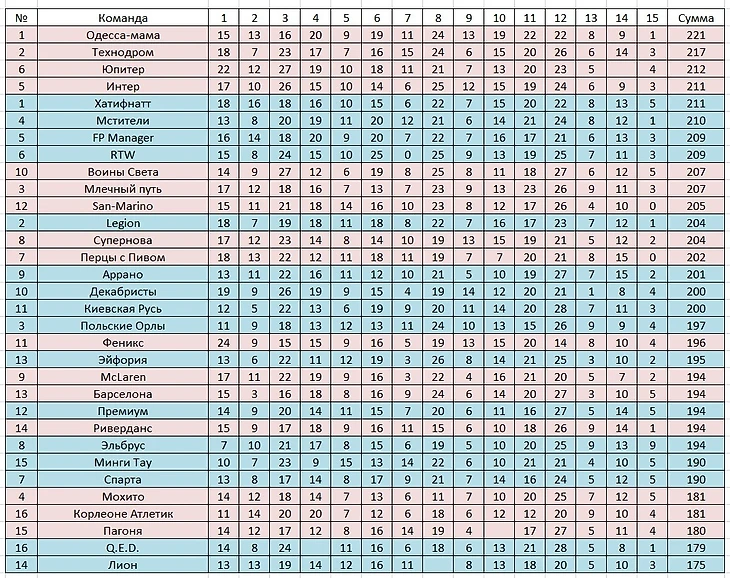 Решил подсчитать сумму угаданных каждой командой вариантов за первый этап. Ниже – мои впечатления от получившегося.