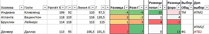 * - по событиям есть запас, но не беру из-за слишком большого значения тотала/форы. В данном случае значение не такое большое, решил исключить из-за потерь Денвера. Скорее всего, изберут низкий темп и засушат, как это было в предыдущих матчах. Поэтому фора и ИТМ соперника смотрятся неплохо, а вот ИТБ самого Денвера уже под вопросом.