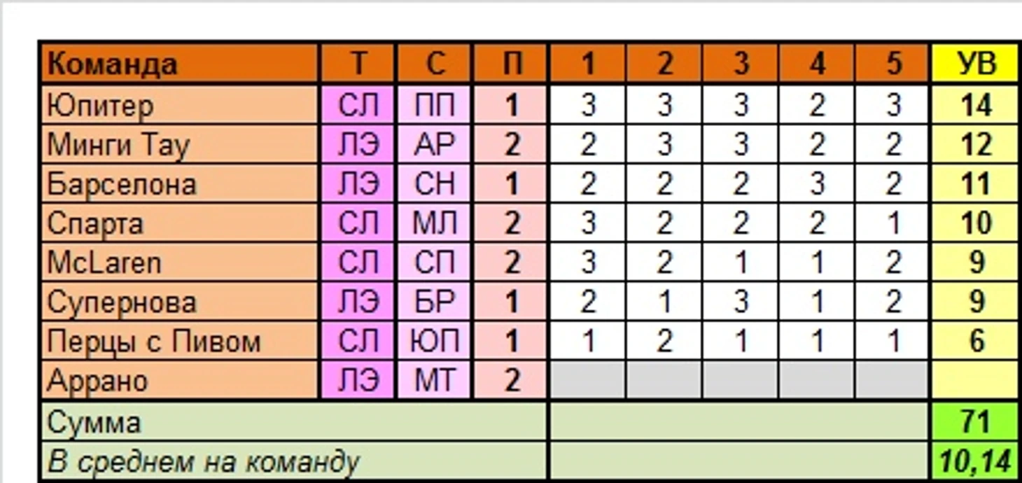 Лучшая команда игрового дня по сумме УВ в целом: Юпитер (14 вариантов)