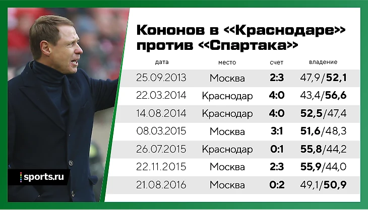 Кононов в «Краснодаре» редко отходил от контроля мяча и атак через середину. С ним «Краснодар» провел 7 официальных матчей против «Спартака» (был еще 1 товарищеский – в феврале 2016-го): в 5 краснодарцы больше владели мячом, в 1 – полноценно отдали мяч сопернику во втором тайме, ведя 3:0. Только в первом и последнем матчах Кононова против «Спартака» его команда проиграла реальную борьбу за владение.