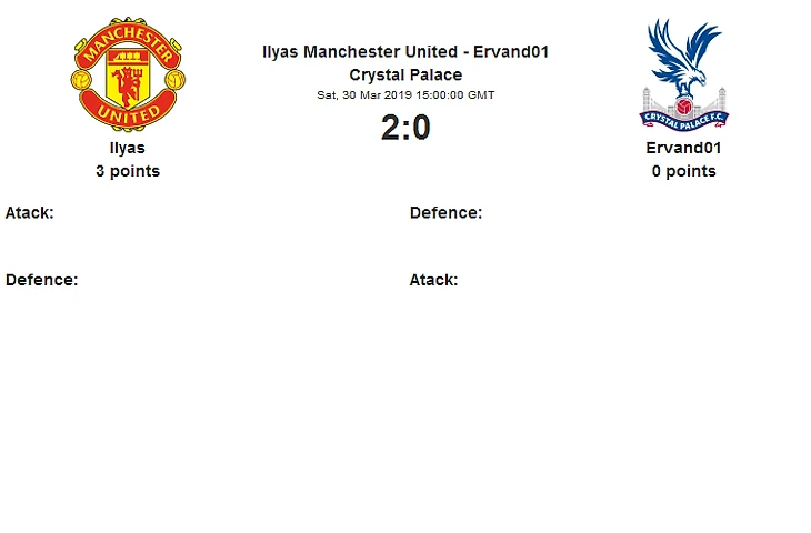 На вторую команду у Ильяса, видимо не хватает времени и сил..- иначе чем еще объяснить такой результат МЮ... Сможет ли он собраться и поставить подножку амбициозному Crystal Palace Ervand01, ведущему борьбу за попадание в ТОП-6 первого этапа ?