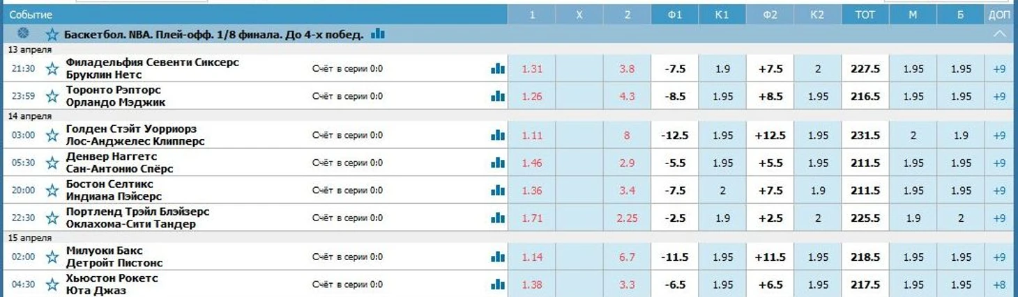 NBA:Выложу тут прогнозы сразу на все матчи. Кстати, хочу заметить я поставил как только данные события появились в линии. 11 апреля утром сделал ставки и больше ничего ставить не буду. Поехали!