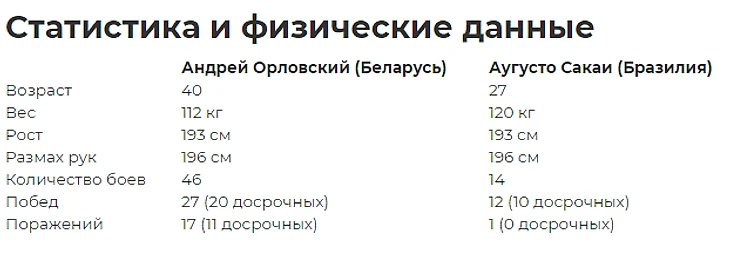 Одним из самых интересных событий предварительного карда UFC Fight Night 150 должен стать бой Андрея Орловского против Аугусто Сакаи. Два тяжеловеса, обладающих мощным нокаутирующим ударом, будут выявлять сильнейшего в очной схватке. Орловский потерпел поражения в двух предыдущих боях, в то время как его бразильский оппонент сейчас имеет серию из трех побед подряд. Букмекеры прогнозируют очередное поражение белорусского бойца, но так ли все очевидно? Попробуем составить собственный прогноз и сделать удачную ставку на поединок.