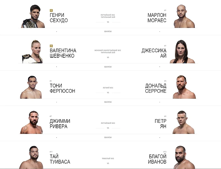 Бой равный 50/50. Фергюсон будет сушить оппонента, дёргая то в стойке то в борьбе, чтобы в третьем раунде, когда он выдохнется прикончить. Ковбой же будет расстреливать на дистанции и двигаться, избегая борьбы. Сказать однозначно здесь нельзя, но мы надеемся, что ударная мощь Ковбоя станет решающей.