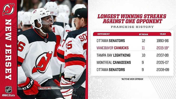 Хоккеисты New Jersey Devils продлили свою серию побед в матчах vs. Canucks до 11 игр, тем самым установив вторую по длительности победную серию в истории франшизы против одного конкретного соперника;