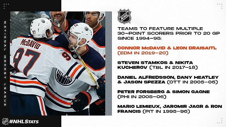 Форварды Edmonton Oilers Леон Драйзайтль (14-20—34) и Коннор Макдэвид (11-19—30) стали пятыми одноклубниками за последние 25 лет, которым удалось набрать минимум по 30 очков каждому до того, как их клуб сыграл 20 матчей регулярного чемпионата;