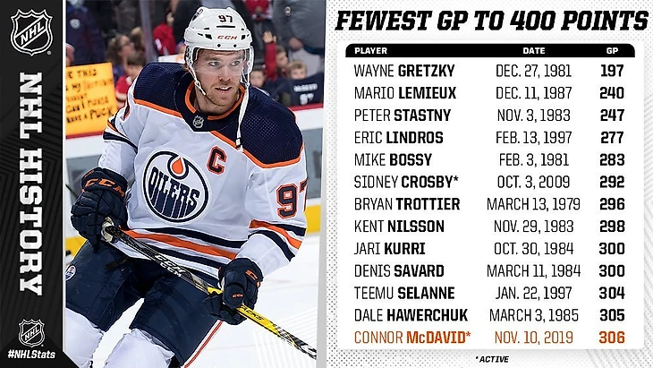Форварды Edmonton Oilers Коннор МакДэвид стал 13 хоккеистом в истории НХЛ, кому потребовалось не более 306 игр для того, что бы набрать 400 очков в матчах регулярного чемпионата;