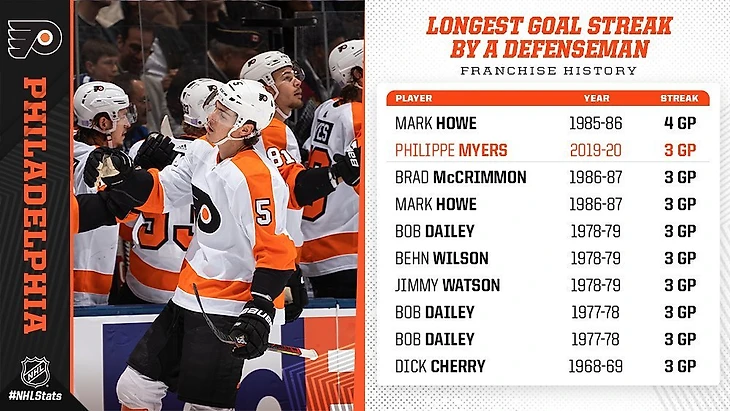 Защитник Philadelphia Flyers Филипп Майерс стал 7 защитником в истории франшизы, кому удалось отметиться заброшенной шайбой в 3-х матчах подряд и первым после сезона 1986-87 года;