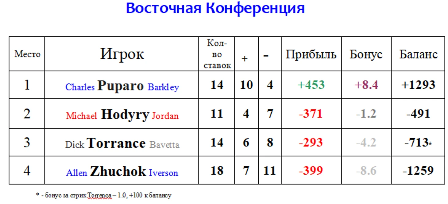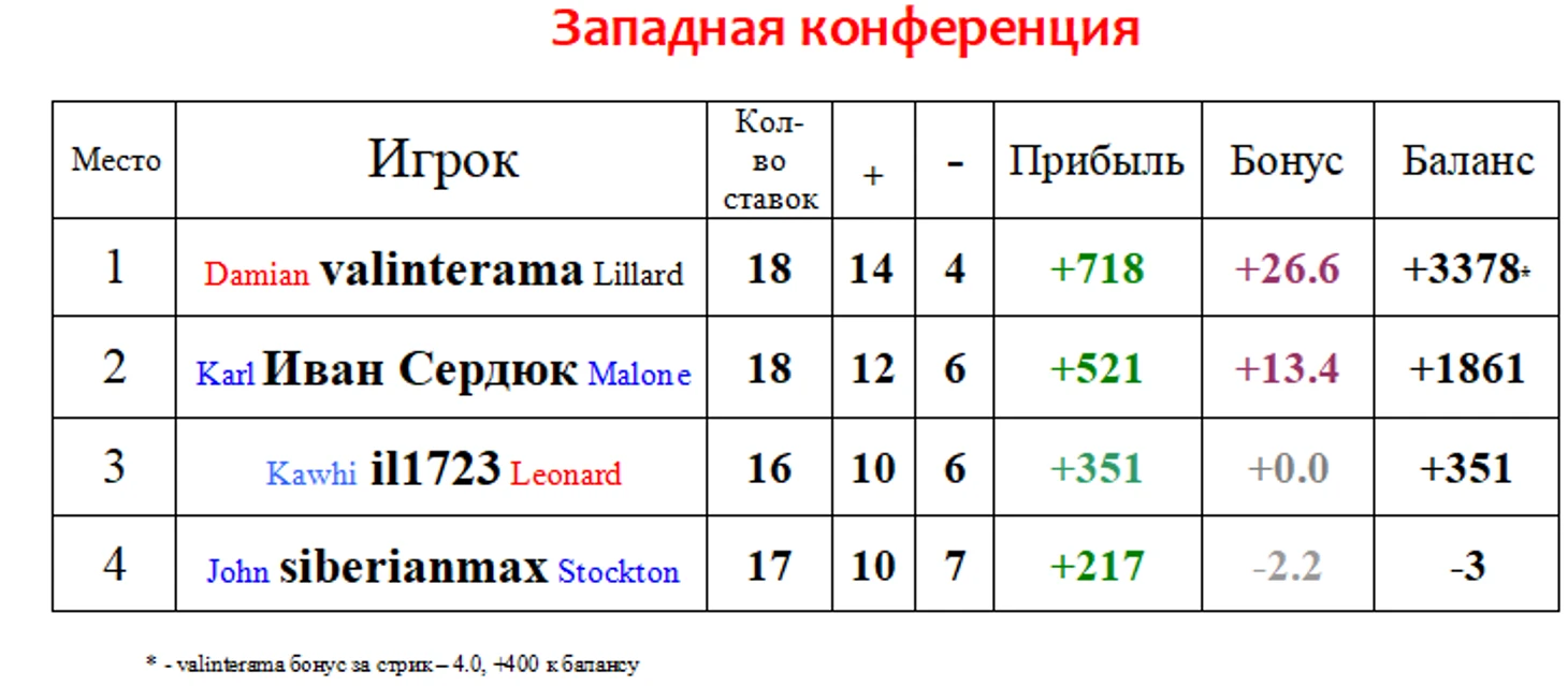 Как вы поняли по анонсу, valinterama по-прежнему горяч , он дал уже 11 точных ставок подряд! И вновь все ставки были исключительно ТБ. Бонусы в этот раз не такие большие, ибо пара ставок зашли в несколько очков, однако очередные бонусы за стрик (суммарно их уже 400) только упрочили лидерство DAME DOLLA в западной конференции.