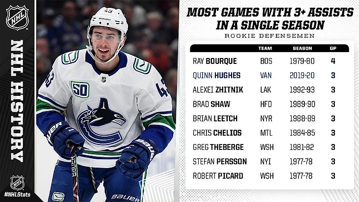 • Только один защитник-новичок в истории лиги имеет больше матчей с 3+ результативными передачами, чем защитник Vancouver Canucks Куинн Хьюз;