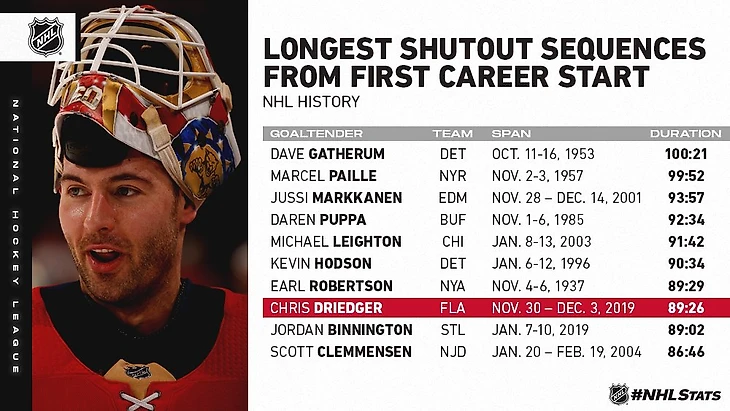 • Голкипер дебютант Florida Panthers Крис Дридгер записал на свой счет дебютную сухую серию в 89:26 минуты со старта своей карьеры в НХЛ. Отмечу, что серия минут без пропущенной шайбы Дридгера является 8-й в истории НХЛ;