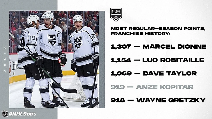 Форвард Los Angeles Kings Анже Копитар вышел на четвёртое место по очкам в истории франшизы, всего в активе словенского форварда теперь 919 очков. Он обошёл легендарного Уэйна Гретцки, заработавшего в составе Kings 918 баллов. Лидерство принадлежит Марселю Дионну — 1307 очков;