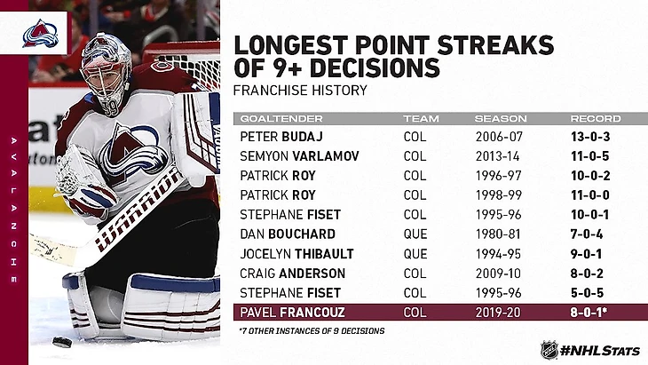 Клубный рекорд принадлежит Петеру Будаю, с которым в сезоне-2006/07 Avalanche набирали очки 16 матчей подряд. С Семёном Варламовым в сезоне-2013/14, Avalanche также набирали очки 16 матчей подряд. Однако с Будаем были выиграны 13 матчей на том отрезке, а с Варламовым 11;