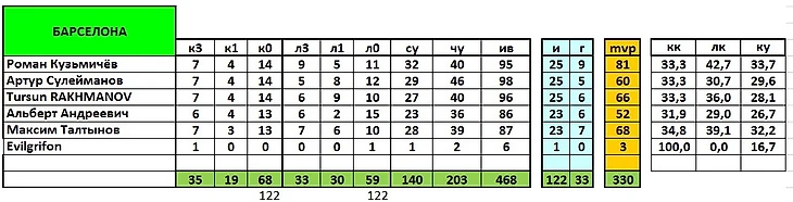 Худшая команда сезона. Барселона выступила по олимпийскому принципу «Главное не победа, а участие». Во всех турнирах поучаствовали, во всех – не оказались лучше хоть кого-нибудь. Очень слабая игра, во многих матчах буквально с самого начала МДП было понятно, что Барса сможет выиграть лишь чудом – настолько несбалансированными были прогнозы команды. Даже если просто обратить внимание на статистику по своим/чужим УВ, сразу станет понятна причина поражений. Огромный процент УВ взятый соперниками Барсы (43.38%) – это следствие даже не невезучести, а именно того, что команда не берёт очевидные варианты, которые в итоге с лёгкостью достаются соперникам. Плюс цифра общих ИВ за матч (18.72 в среднем) также говорит о том, что команда пока ещё не очень понимает, как играть, чтобы хотя бы не проигрывать разгромно.
