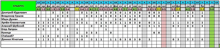 Эльбрус по большому счёту ничем не удивил. Команда совсем неопытная, не слишком хорошо понимающая тактику игры в 7-40, потому и совершающая классические ошибки в прогнозах на матч с заранее предсказуемым результатом. Горцы играли одной и той же пятёркой в большинстве матчей сезона и выставляли практически одинаковые прогнозы на всех линиях. Что с одной стороны свидетельствует о тактической негибкости команды, с другой – о жёсткой тренерской руке, с третьей – об отсутствии идей и неопытности коллектива. Да и те самые одинаковые прогнозы часто были, мягко говоря, специфическими. В итоге команда имела по 20 игровых вариантов в среднем за матч, что звучит наверно красиво, но на самом деле означает ровно противоположное. Чем больше у тебя ИВ, тем хуже твои прогнозы, это факт доказанный кровью (виртуальной). И если один раз нестандарт на всех линиях может прокатить, то на длинной дистанции сезона тебя будут бить с завидной регулярностью. Что и происходило в течение всего чемпионата. Об этом же свидетельствует и статистика крупных побед с поражениями. Когда у тебя на всех линиях что-то типа 3-4-8-16-36, то ты или уничтожаешь соперника по полной, или с треском разбиваешься сам. Очевидно, что второе случается чаще, всё-таки совсем малопредсказуемые МДП случаются редко. И в этих случаях даже не самый удачно играющий соперник аккуратно набирает своё и берёт 3 очка малой кровью.