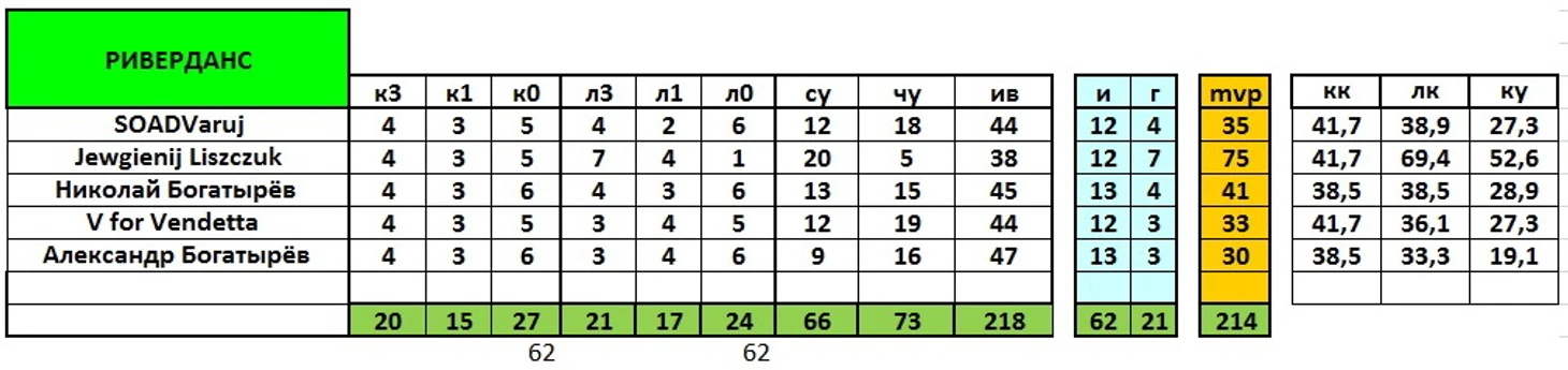 Вот и закончил свой, однажды славный, а затем всё больше тягостный путь Риверданс. Команда, когда-то ставшая самым сенсационным чемпионом в истории, взявшая золото в свой первый же сезон (тогда она называлась «Свидетели Трансфера Коноплянки)», впоследствии оказалась никому не нужна и медленно умирала пару лет. Печальный и закономерный итог, к сожалению, случился прямо посреди сезона, но с самого начала команда испытывала гигантские трудности с составом. Причём играл Риверданс не сказать, чтоб уж очень отвратительно. Временами и брали очки и навязывали борьбу, но участь команды была решена с самого начала. Вроде и хочется что-то хорошее сказать про коллектив, но это тот случай, когда снявшуюся команду совсем не жалко, потому что и коллектива не было и сезон Риверданс остальным игрокам сильно подпортил. Ведь из-за риверов в итоговой таблице прописалась куча технарей, а это никогда не шло на пользу ни одному турниру. В общем, остаётся надеяться, что таких участников у нас больше не будет, а в будущем все тренеры будут ответственней подходить к подготовке своих команд к сезону. Прощай, Риверданс.