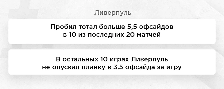 “Атлетико” всегда играет вторым номером, когда встречается с топовым соперником. Симеоне умело выстроил игру от обороны, что практикует уже долгие годы. Однако сегодняшняя оборона “матрасников” вряд ли способна конкурировать с атакующей мощностью “Ливера”. Их удел играть на перехватах и создавать искусственный офсайд. А что у нас делает “Ливерпуль”? Больше 5,5 офсайдов в 10 из последних 20 матчей. А в остальных 10 матчах они ни разу не опускались планки ниже в 3,5 за игру. Выводы очевидны.