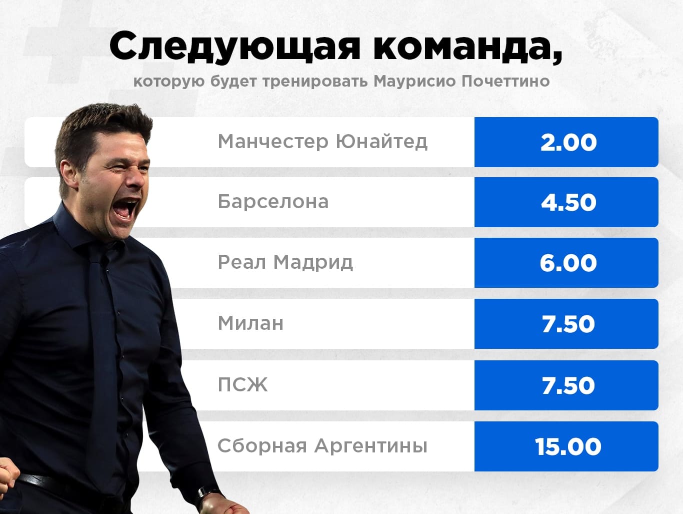 С момента увольнения из "Тоттенхэма" к Почеттино сохраняется устойчивый интерес. При этом в списке претендентов все сплошь топ-клубы: "Реал", "Манчестер Сити", "Манчестер Юнайтед", "Атлетико" и даже "Барселона". "Больше, чем клубу" Маурисио якобы отказал после увольнения Эрнесто Вальверде.