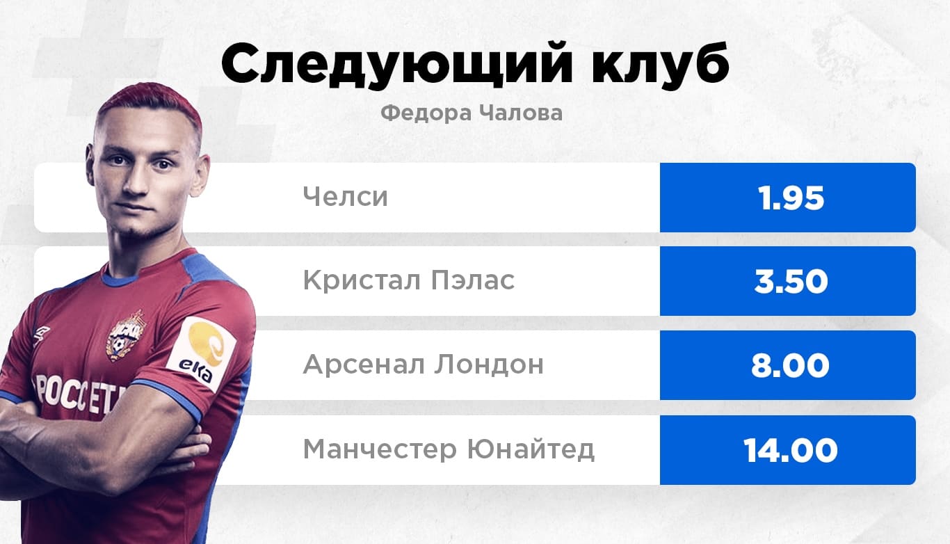Главным пострадавшим в итоге оказался Чалов. Он провалил нынешний сезон РПЛ по всем показателям. За 22 матча Федор забил всего шесть голов, хотя еще недавно становился лучшим бомбардиром нашей лиги. Тем не менее, букмекеры высоко оценивают вероятность отъезда российского форварда в зарубежный клуб. И не куда-нибудь, а в "Челси"! Кэф на этот вариант — 1.95. Видимо, давние партнерские отношения Гинера и Романа Абрамовича до сих пор учитывается.