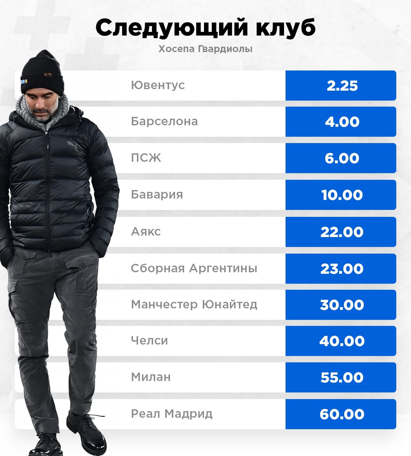Несмотря на то, что Гвардиола так и не смог выиграть Лигу чемпионов где-то еще, кроме как в "Барселоне, его все равно мечтают видеть у себя топ-клубы. Поэтому в "Ювентусе", где уже всех достал Маурицио Сарри, радостно потирали руки. На то, что Пеп переберется в Турин, дается сочный кэф — 2.25.
