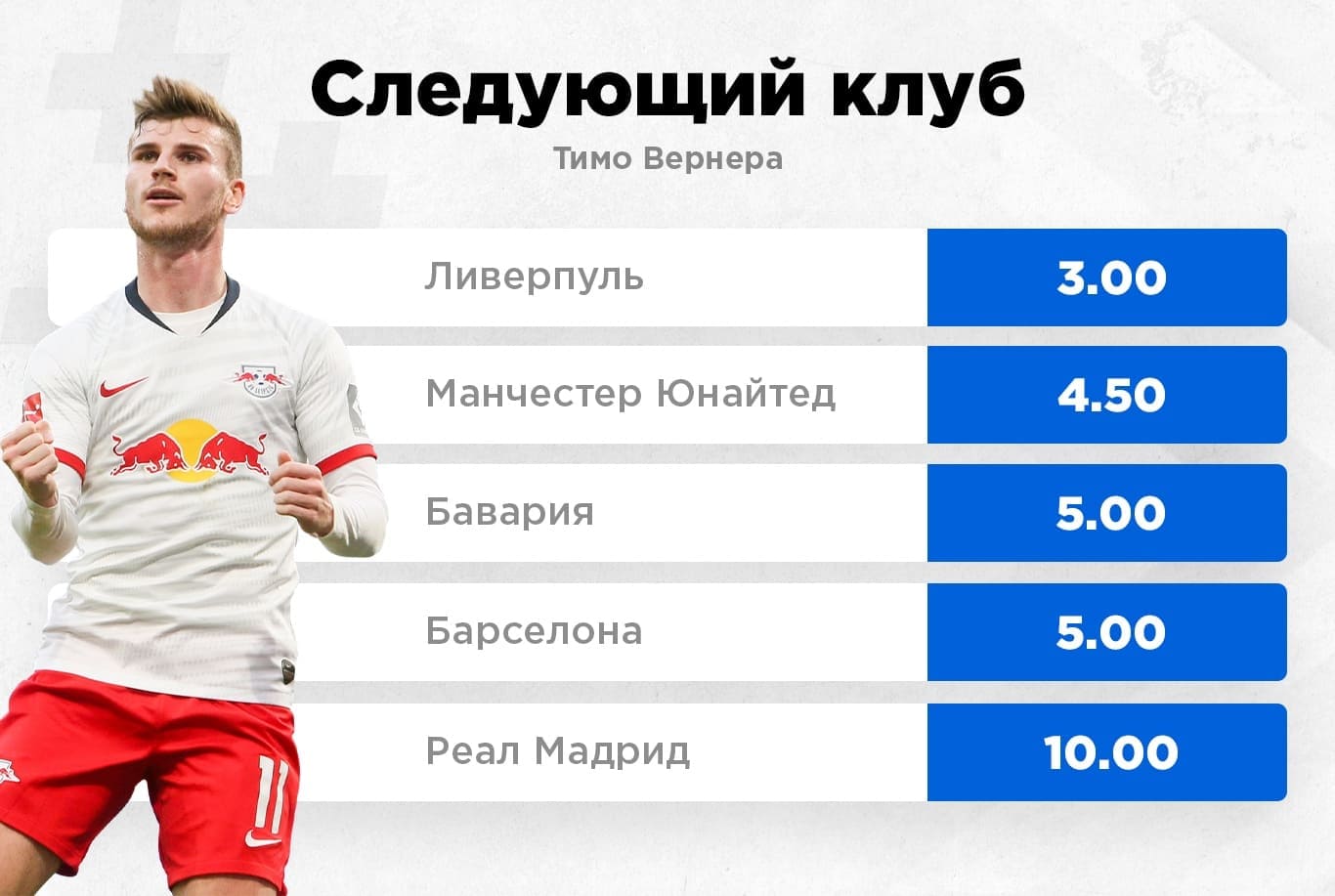 Но эти разговоры будут актуальны летом. Пока что команда Клоппа — главный претендент на Вернера. Кэф на переход форварда в "Ливерпуль" — 3.0.