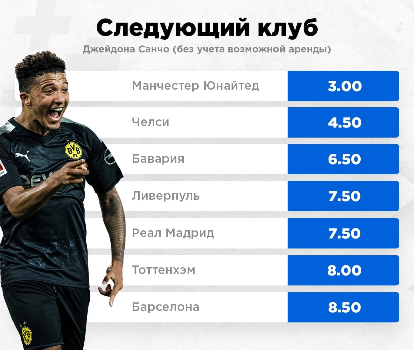 Санчо уже второй год доминирует в Бундеслиге и хочет перейти в более статусный клуб. В своих интервью парень не раз намекал, что мечтает вернуться в Англию. Репортеры моментально конвертировали эти слова в слухи о возможном переходе в "Ливерпуль". Вот только в линии оценивают этот вариант кэфом 7.5, то есть вероятность не так и высока.