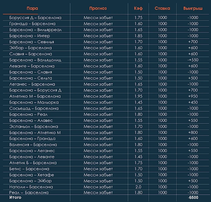 Месси отметился в 14 играх из 30 сыгранных. И уже только эта информация намекает, что ставки на голы Месси приносят минус в текущем сезоне.